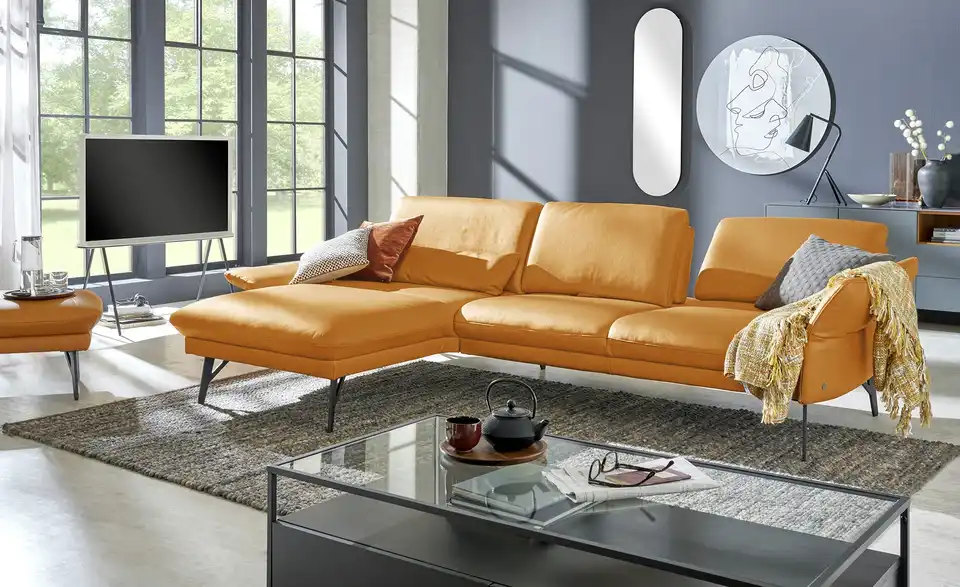 Loftig-modern und mit einem Hauch Industrial-Note präsentiert sich dieses Ecksofa. Es ist komplett mit Echtleder bezogen und wird durch attraktive, dunkle Metall-Winkelfüße getragen. Passe die Sitztiefe ganz nach Deinen Wünschen an und klappe die beiden Armlehnen je nach Bedarf hoch oder runter. Die breite Ottomane lädt zum Ausstrecken ein und macht jeden Filmeabend gleich gemütlicher. Unser Tipp: Mit der Kopfstütze 1928 lässt sich jeder Sitzbereich individuell anpassen. Vielfältigste Verstellmöglichkeiten bei kompromissloser Qualität: Die Multifunktionspolster von himolla werden liebevoll im bayrischen Taufkirchen gefertigt. Hier entstehen individuelle Polster, die Deine Erwartungen an Komfort, Design und Funktion bedingungslos erfüllen.Lieferung & Versand