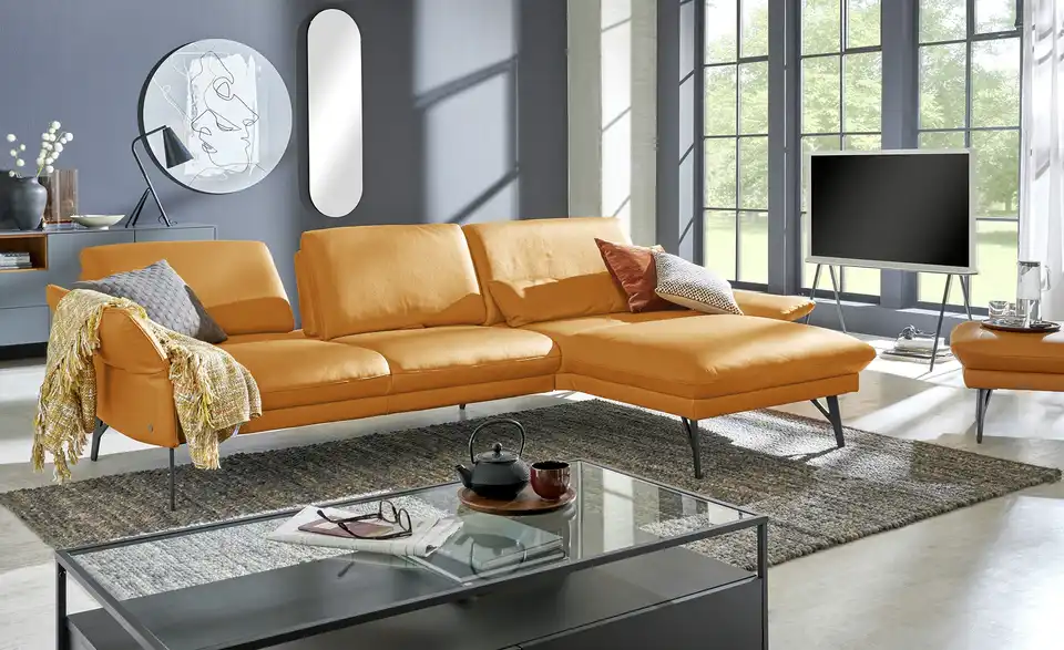 Loftig-modern und mit einem Hauch Industrial-Note präsentiert sich dieses Ecksofa. Es ist komplett mit Echtleder bezogen und wird durch attraktive, dunkle Metall-Winkelfüße getragen. Passe die Sitztiefe ganz nach Deinen Wünschen an und klappe die beiden Armlehnen je nach Bedarf hoch oder runter. Die breite Ottomane lädt zum Ausstrecken ein und macht jeden Filmeabend gleich gemütlicher. Unser Tipp: Mit der Kopfstütze 1928 lässt sich jeder Sitzbereich individuell anpassen. Vielfältigste Verstellmöglichkeiten bei kompromissloser Qualität: Die Multifunktionspolster von himolla werden liebevoll im bayrischen Taufkirchen gefertigt. Hier entstehen individuelle Polster, die Deine Erwartungen an Komfort, Design und Funktion bedingungslos erfüllen.Lieferung & Versand