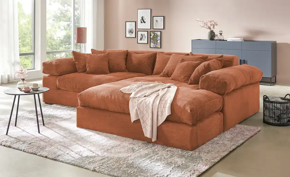 Dieses Ecksofa lädt mit seinen dicken Polsterkissen zum Entspannen ein. Zwölf Zierkissen, zwei breite Armlehnen und eine extra große Ottomane sorgen für ein Plus an Gemütlichkeit. Machen Sie es sich bequem und fügen Sie eigene Dekodecken und -Kissen hinzu. Der einfarbige Bezug ist kombinationsfreudig und sogar auf der Rückseite des Sofas zu finden. So können Sie das Ecksofa auch mittig im Raum oder von der Wand abgerückt platzieren. Entscheiden Sie sich nur noch für Ihre Lieblingsfarbe und wählen Sie zwischen trendigem Cord, kuschelweichem Chenille-Stoff und pflegeleichtem Webstoff.Lieferung & Versand