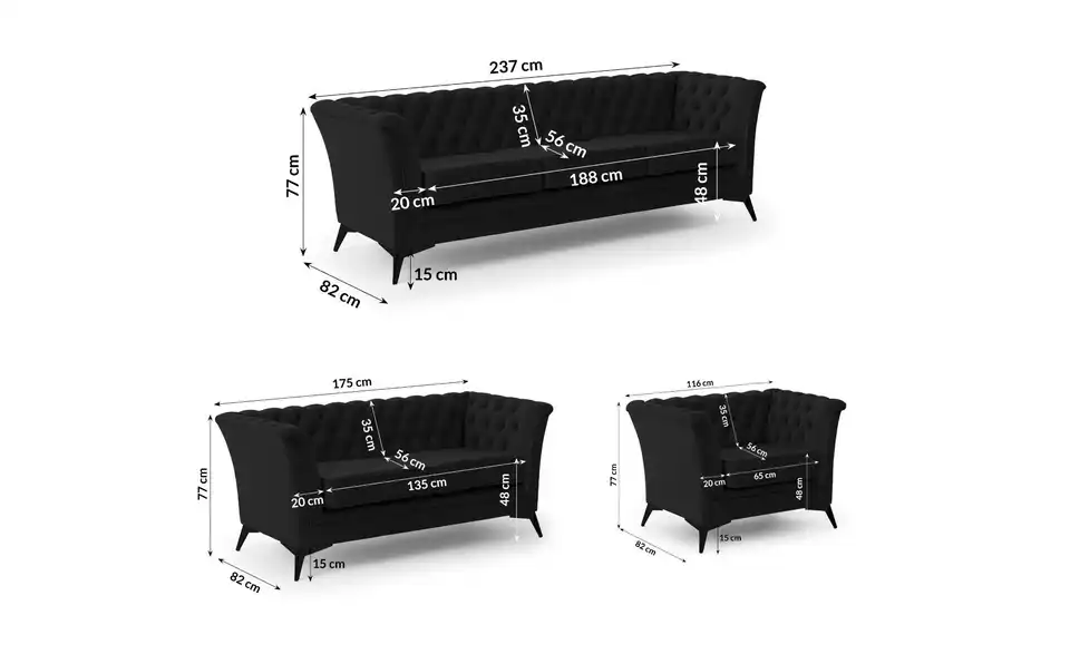 - Lieferumfang / mitgeliefertes Zubehör1 x 3-Sitzer Sofa, 1 x 2-Sitzer Sofa, Sessel, Montagematerial