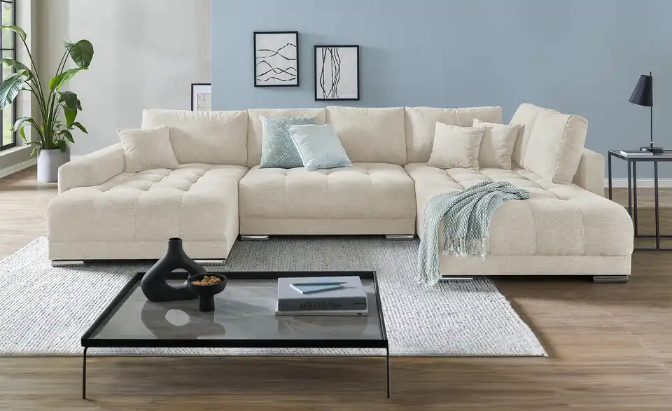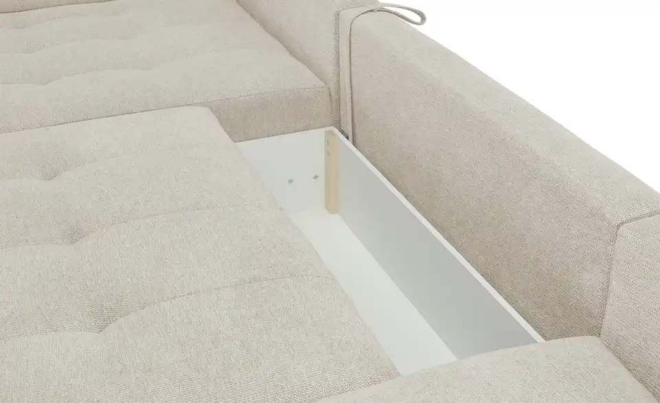 Richtig viel Platz für Freunde und Familie: Diese Wohnlandschaft überzeugt mit zwei einladenden Ottomanen und einer praktischen Schlaffunktion. Sitzen Sie zur Familienfeier bequem zusammen oder genießen Sie in großer Runde einen Filmeabend mit Freunden. Platz gibt es hier genug. Und wenn es doch etwas länger wird, können Sie mit nur wenigen Griffen den Mittelteil umklappen und zu einer Liegefläche umfunktionieren. Dann finden zwei Übernachtungsgäste problemlos Platz. Das dazugehörige Bettzeug lässt sich außerdem im geräumigen Bettkasten unter der Sitzfläche verstauen.Lieferung & Versand