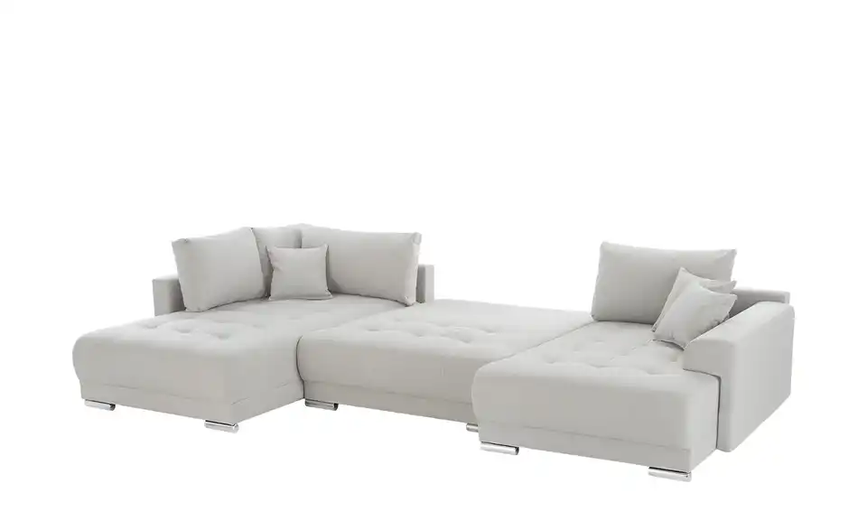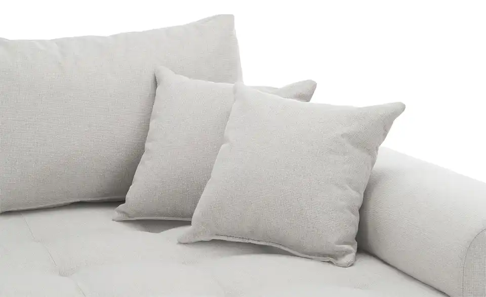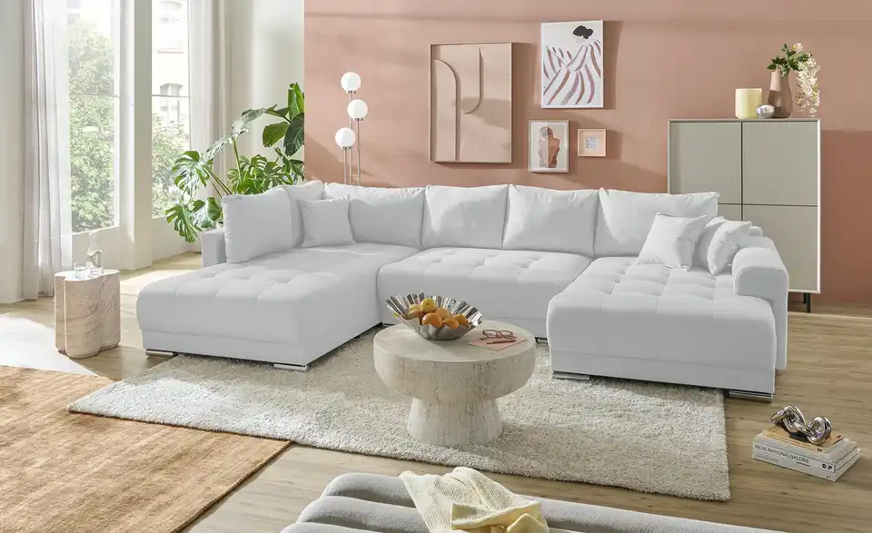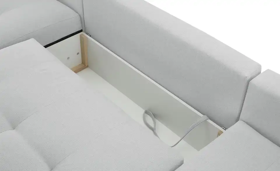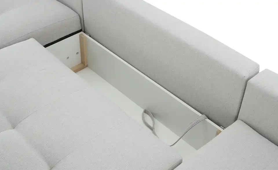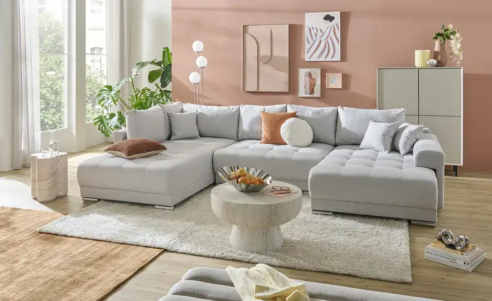 Richtig viel Platz für Freunde und Familie: Diese Wohnlandschaft überzeugt mit zwei einladenden Ottomanen und einer praktischen Schlaffunktion. Sitzen Sie zur Familienfeier bequem zusammen oder genießen Sie in großer Runde einen Filmeabend mit Freunden. Platz gibt es hier genug. Und wenn es doch etwas länger wird, können Sie mit nur wenigen Griffen den Mittelteil umklappen und zu einer Liegefläche umfunktionieren. Dann finden zwei Übernachtungsgäste problemlos Platz. Das dazugehörige Bettzeug lässt sich außerdem im geräumigen Bettkasten unter der Sitzfläche verstauen.Lieferung & Versand