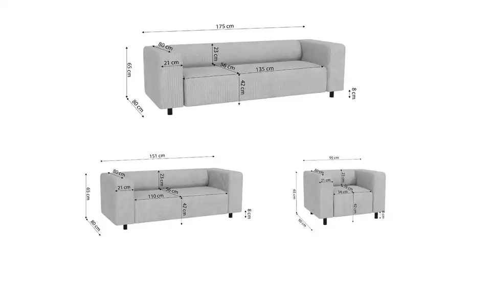 - Lieferumfang / mitgeliefertes Zubehör3-Sitzer Sofa, 2-Sitzer Sofa, Sessel, Montagematerial