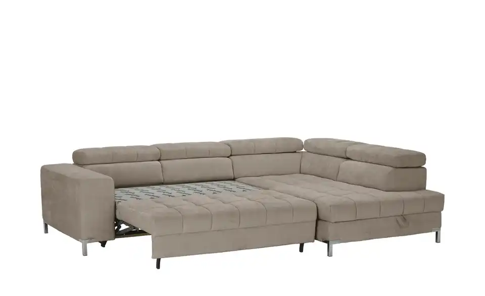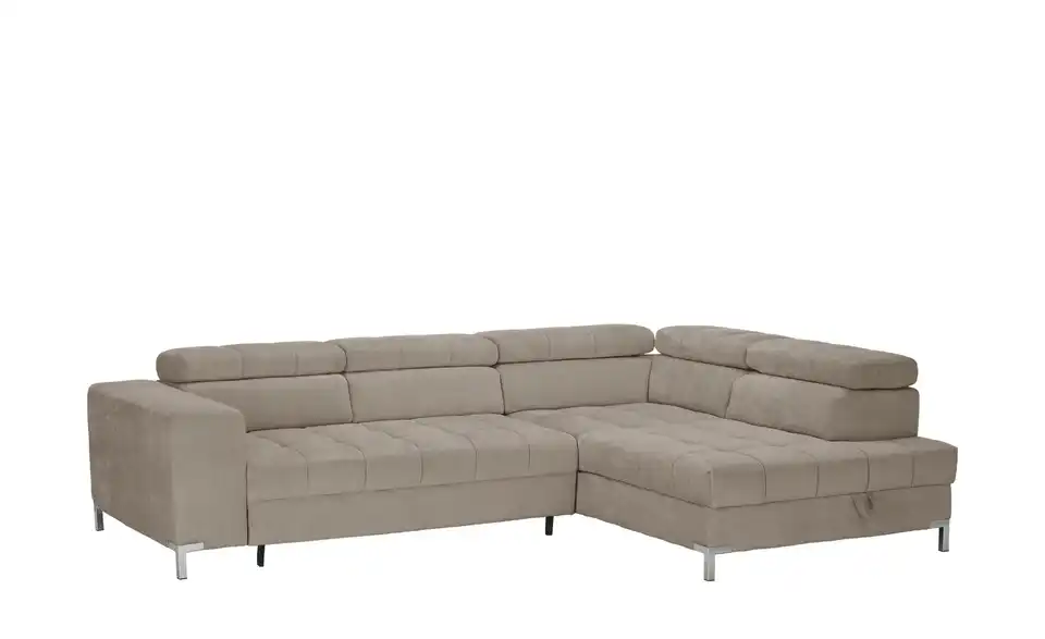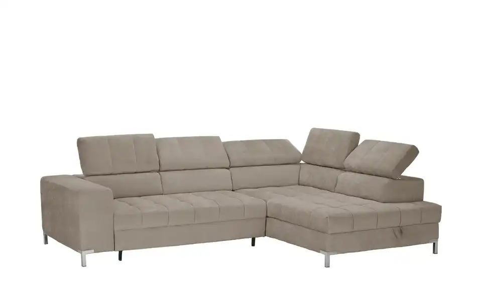 Dieses Ecksofa ist die perfekte Ergänzung für Deine Innenausstattung. Die Couch lässt, was den Komfort angeht, mit der Kopfteilverstellung keine Wünsche offen, ist mit einem echt bespannten Rücken ausgestattet, sodass sie auch mitten im Raum aufgestellt werden kann, und ist mit einem Federkern sowie einer bequemen Polsterung aus Schaumstoff für das maximale Wohlfühlerlebnis versehen. Die Basis des Sitzmöbels bildet ein Gestell, welches aus Metall besteht. Das Sofa verfügt über einen integrierten Bettkasten, lädt mit der stattlichen Sitztiefe von 62 cm zum Verweilen ein und nimmt insgesamt 284 x 97 x 200 cm ein. Dieses Polstermöbel überzeugt als komfortable und ästhetische Ergänzung für Dein Zuhause.Lieferung & Versand