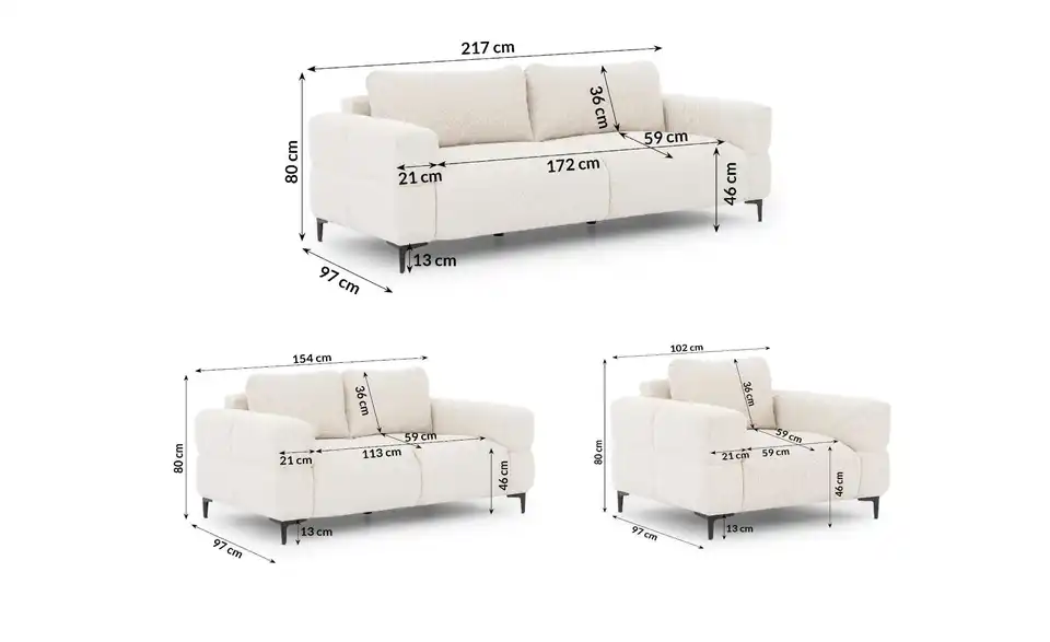 - Mehr zu MaßenSitzbreite - 3-Sitzer 172 cm; 2-Sitzer: 113 cm; Sessel 59 cm